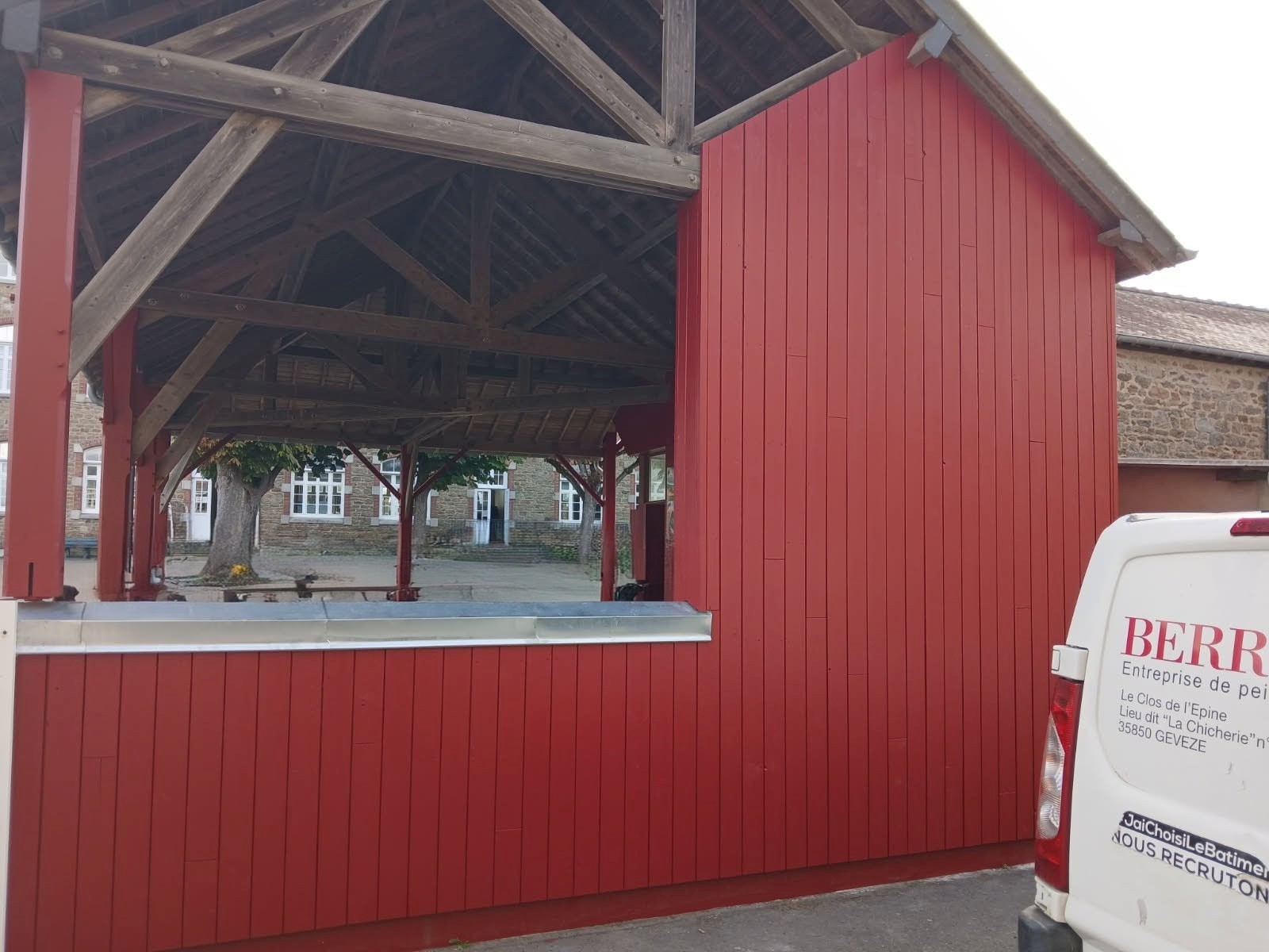 Peinture sur poteaux et bandeaux du local à vélos extérieurs.